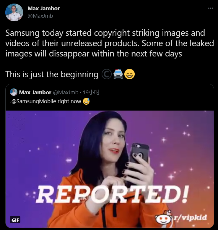 据 AllAboutSamsung 的 Max Jambor,三星近日也向爆料者发送了版权声明,要求删除爆料的图片和视频。
