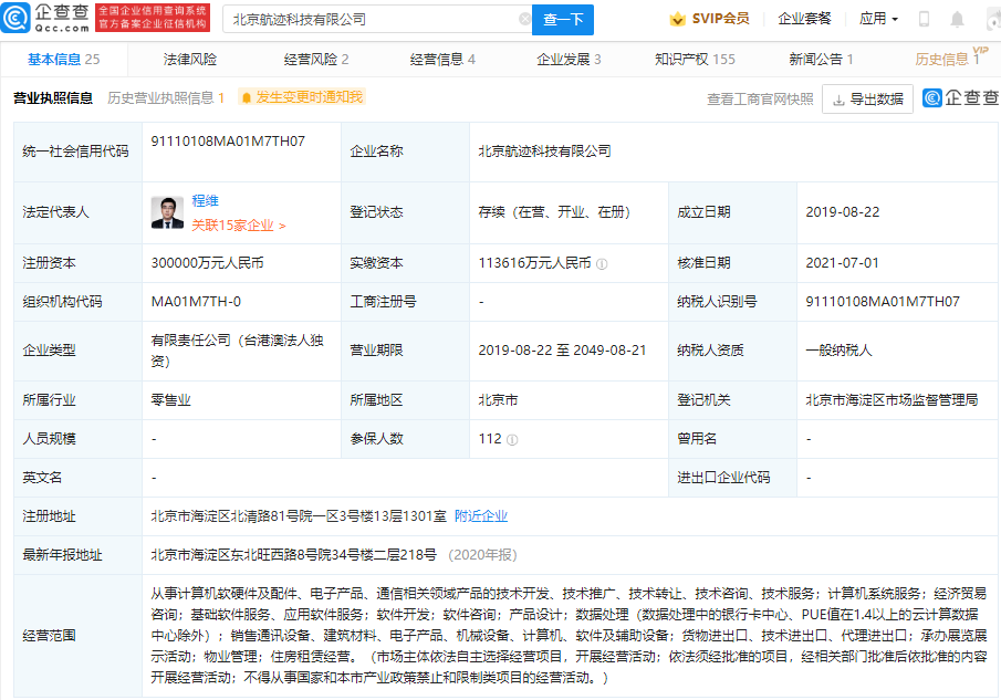 企查查信息显示,该公司成立于 2019 年,法定代表人为滴滴出行创始人程维,经营范围包含:基础软件服务、应用软件服务;软件开发;产品设计等。IT之家获悉,该公司由 Voyager (HK) Co., Limited 全资控股。