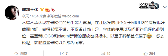 王化表示,不得不承认现在米粉的动手能力真强,网传的 MIUI 13 的海报做得很不错,细节满满,甚至连他都差点信了,他还表示欢迎这些米粉以后成为同事。