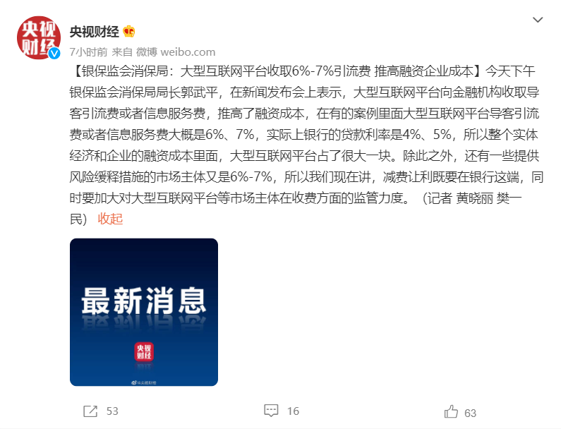 9 日消息 根据央视财经消息,7 月 8 日下午,银保监会消保局局长郭武平,在新闻发布会上表示:大型互联网平台向金融机构收取导客引流费或者信息服务费,推高了融资成本,在有的案例里面大型互联网平台导客引流费或者信息服务费大概是 6%、7%,实际上银行的贷款利率是 4%、5%。