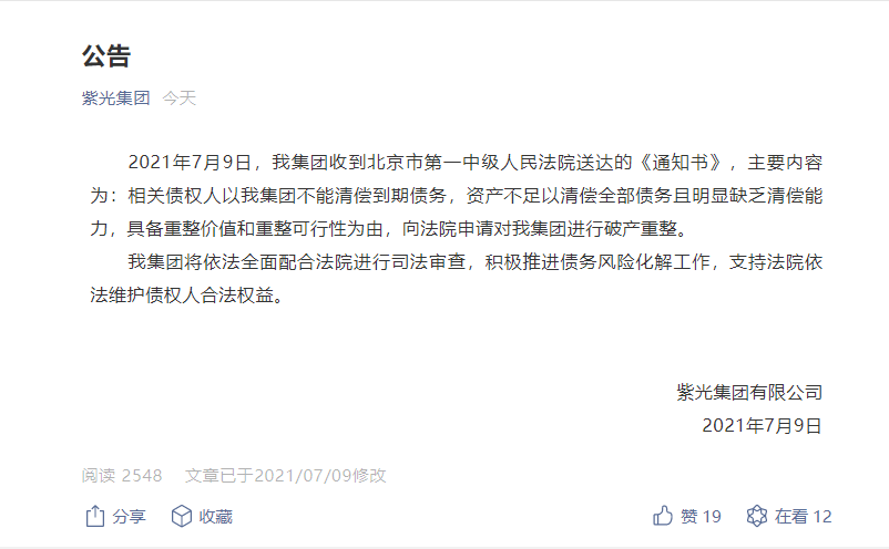 证券时报,紫光集团方面现对此回应表示,集团将依法全面配合法院进行司法审查,积极推进债务风险化解工作,支持法院依法维护债权人合法权益。