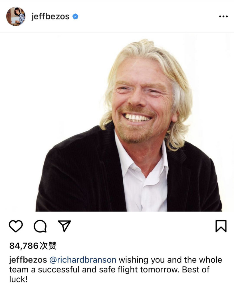 “@richardbranson,祝愿你和整个团队明天能够完成一次成功而又安全的飞行。”贝索斯在 Instagram 上发帖称,“祝你好运。”
