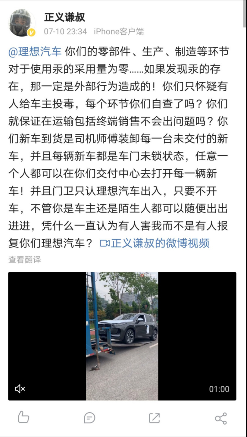 11 日消息,近日,有车主表示在理想汽车在后座上发现液态水银。对于此次事件,车主孙先生昨日晚在其个人微博“正义谦叔”再度发文称,理想并未自查每个环节,认为新车交付中心人员可以随意进出,存在报复理想汽车的可能性而不应只怀疑车主被投毒。