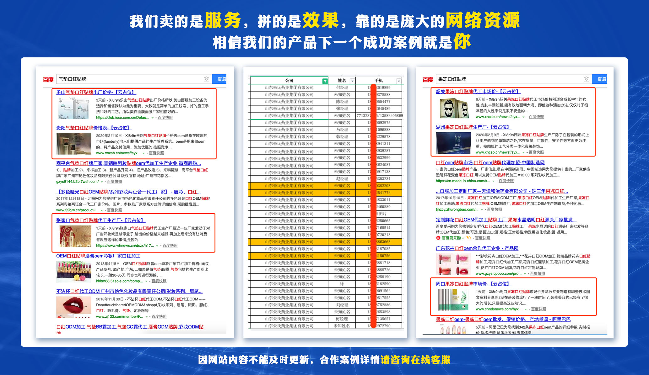 百度网站搜索引擎推广几乎出现在所有的搜索引擎中,如中铁建设集团、搜狐、新浪、凤凰、中国之窗、平安等。如中国网通、京通和平安。百度网站的产品和服务包括:外部连锁推广、实用产品介绍、单一产品展示、搜索引擎排名、内容发布、在线广告等。