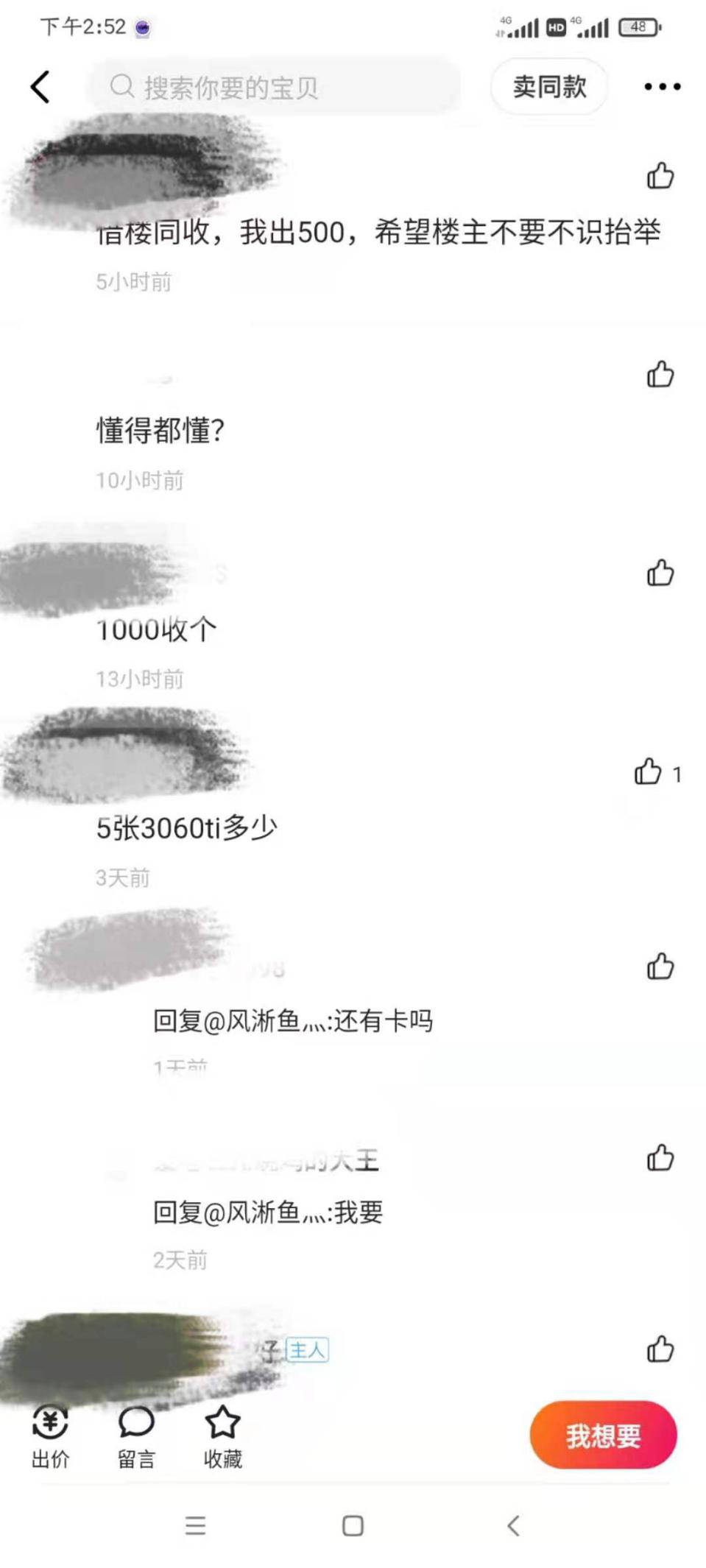在二手电商平台上,部分出售“四川显卡”的页面评论区里,内容整齐划一全是低价“蹲”一张显卡,至于开出的价格自然也低到离谱。