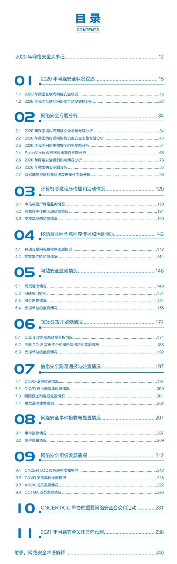 《2020 年中国互联网网络安全报告》 汇总分析了 CNCERT/CC 自有网络安全监测数据和 CNCERT/CC 网络安全应急服务支撑单位报送的数据,具有鲜明的行业特色和重要的参考价值,内容涵盖我国互联网网络安全态势分析、网络安全监测数据分析、网络安全事件案例详解、网络安全政策和技术动态等多个方面。其中,本报告对计算机恶意程序传播和活动、移动互联网恶意程序传播和活动、网站安全监测、DDoS 攻击监测、 信息安全漏洞通报与处置、网络安全事件接收与处置等情况进行 深入细致的分析,并对 2020 年的典型网络安全事件进行专题介 绍。此外,本报告还对网络安全组织发展情况和 CNCERT/CC 举办的重要网络安全会议和活动等进行了阶段性总结。最后,本报告对 2021 年网络安全关注方向进行预测。