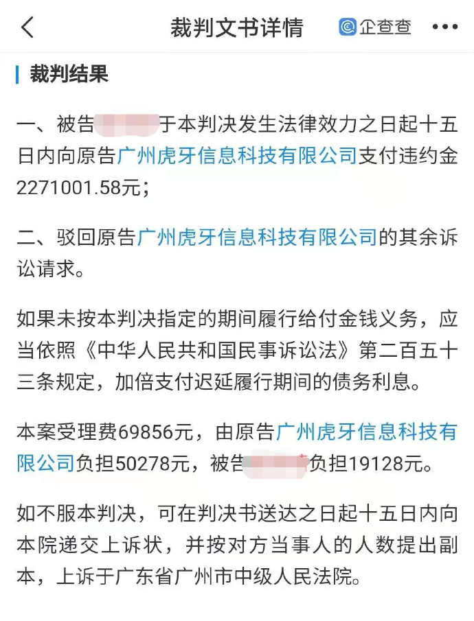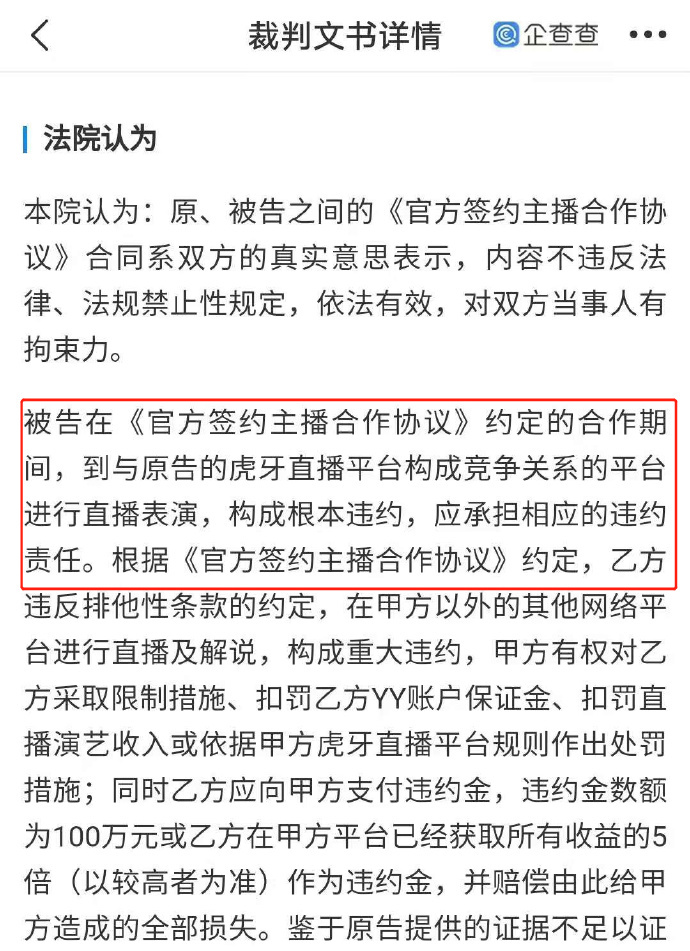 法院认为,在协议期内,被告在虎牙竞争平台进行直播表演,构成根本违约。判决结果为喵喵喵子支付虎牙违约金 2271001.58 元。