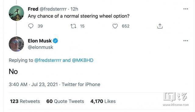 昨日,有网友询问是否可以为用户提供选项,让传统方向盘成为选配时,马斯克的回答直截了当:“No”。