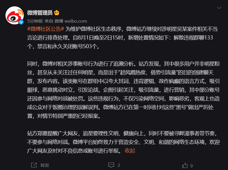 今日,微博管理员再次发布公告,继续对涉明星吴某案件相关不当言论进行排查处理。自 8 月 1 日晚至 2 日 15 时,新增处置情况如下:解散违规群聊 133 个,禁言和永久关闭账号 503 个。