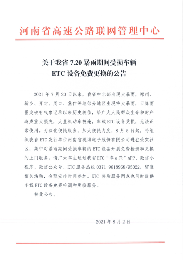 为深化便民服务,加大便民力度,8 月 5 日起,将组织河南省 ETC 发行单位河南省视博电子股份有限公司进驻受灾社区,集中对暴雨期间受损车辆的 ETC 设备开展免费检测和更换的上门服务。