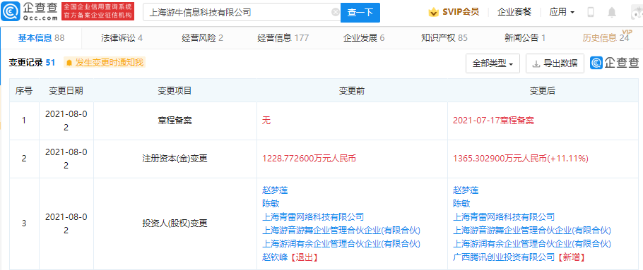 3 日消息 昨日,上海游牛信息科技有限公司发生工商变更,新增股东广西腾讯创业投资有限公司,同时公司注册资本由 1228.77 万元人民币增加至 1365.3 万元人民币,增幅为 11.11%。
