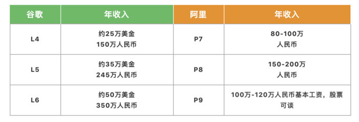 国内情况如何?在国外著名博客网站 medium 上,名为 LaiOffer 的博主拿谷歌(L4-L6)和阿里(P7-P10) 的薪资水平进行了对比。也就是说,除了极个别的岗位特别匹配的情况,国内的公司给到的最好的薪水,也是和硅谷薪水持平。