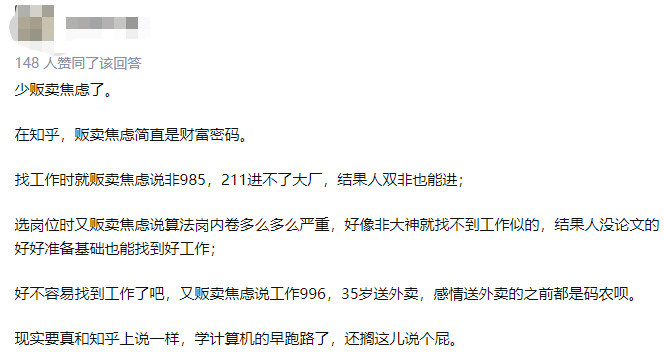 话里话外,都在表明,这个话题“如何看待 2022 年秋招算法岗人间地狱?”在贩卖焦虑。
