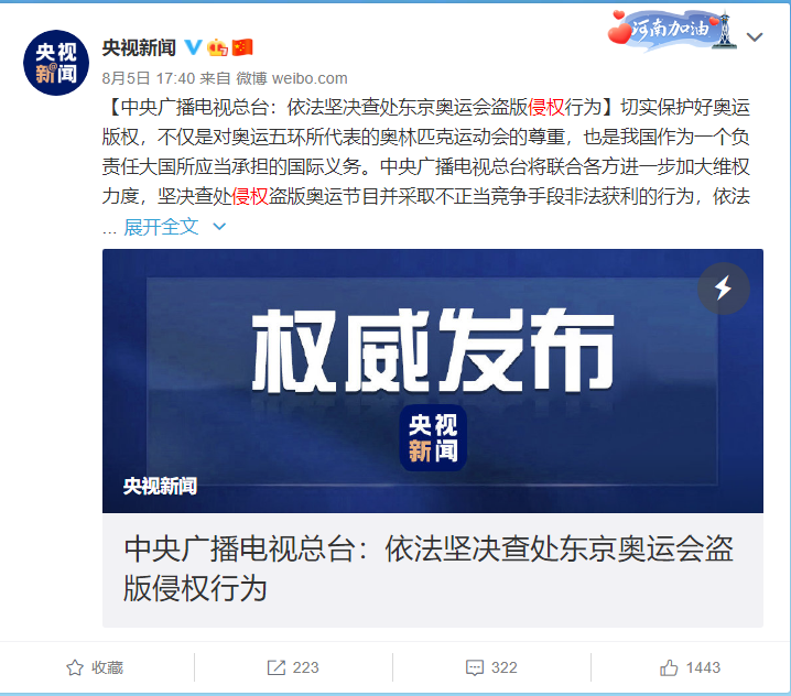 7 日消息 东京奥运会赛事内容成为盗版侵权的“重灾区”。8 月 5 日,央视新闻官方发文谴责短视频侵权,呼吁保护奥运会版权的同时,表示已对各类侵权活动调查取证。