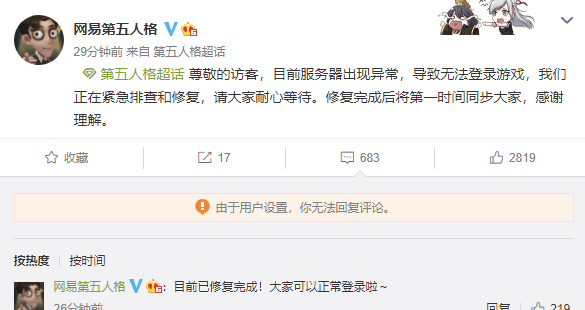 11 月 3 日消息,今日晚间,大量网友反映网易旗下多款游戏出现网络故障,导致无法登录和断连。网易旗下的第五人格游戏官方微博回应称,服务器出现异常,导致无法登录游戏,正在紧急排查和修复。随后在评论中,第五人格官方声称已修复完成。