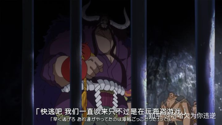 凯多对被打成重伤被囚禁的基德说:喂,你小子,去告诉他们,去跟你同世代的蠢货们讲‘快逃吧,我们一直以来只不过是在玩海盗游戏’。