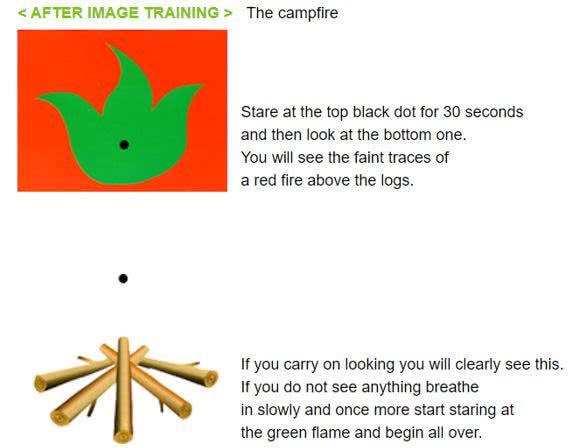 第一课,看火。闭上眼睛,深呼吸三次,在下图中盯着上方小黑点30秒,再把视线移到下边的小黑点。