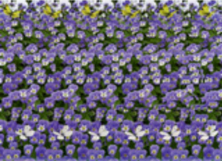 第二课,看3D图像。请大家盯着图中下方的紫色点30秒。告诉我,伴随着被紫罗兰吸引的蝴蝶,你还看到了什么?