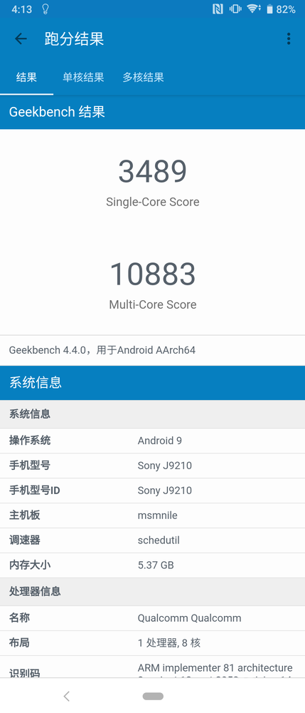 作为全新的旗舰产品,索尼Xperia 5依然搭载目前顶尖的高通骁龙855移动平台,这颗芯片的性能表现已经得到不少消费者的认可。我们使用GeekBench来测试索尼Xperia 5的性能表现,经过实测后,这部手机获得单核心3489分与多核心10883分的成绩,这样的性能表现已经能够满足日常使用,即使运行大型游戏也不会出现卡顿现象。