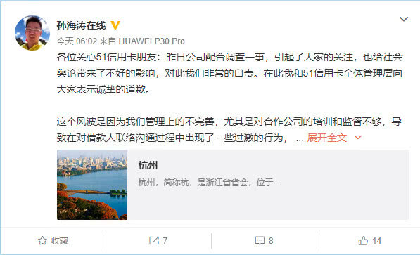 大家好,我是51信用卡的创始人兼CEO孙海涛。昨日公司配合调查一事,引起了大家的关注,也给社会舆论带来了不好的影响,对此我们非常的自责。在此我和51信用卡全体管理层向大家表示诚挚的道歉。这个风波是因为我们管理上的不完善,尤其是对合作公司的培训和监督不够,导致在对借款人联络沟通过程中出现了一些过激的行为,给个别借款人造成了伤害,为此我们非常抱歉。此事也引起了51信用卡员工和家属们的担心,特别感谢每位51信用卡人的付出,因为我们的工作不到位给大家造成了一些困扰,在此我也要给大家道歉。