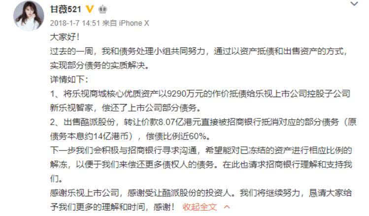 在发完长文后的四天,甘薇就全身心的投入到了处理债务的事务中。在三年的债务处理过程中,甘薇自身名下的资产也受到牵连全被冻结,暂时仍处于不可处理的状态。