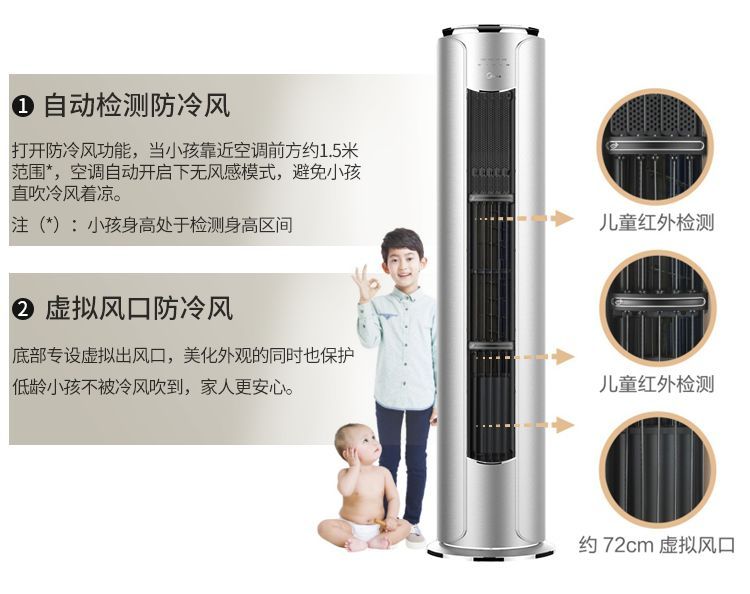 当孩子远离空调时,美的舒适星柜机空调正常送风;当孩子接近空调后,空调自动开启无风感模式,空调自动开启无风感模式,避免小孩直吹冷风着凉,呵护孩子的健康。同时,由于开启无风感模式,导风条处于关闭状态,也防止孩子将手伸入空调。