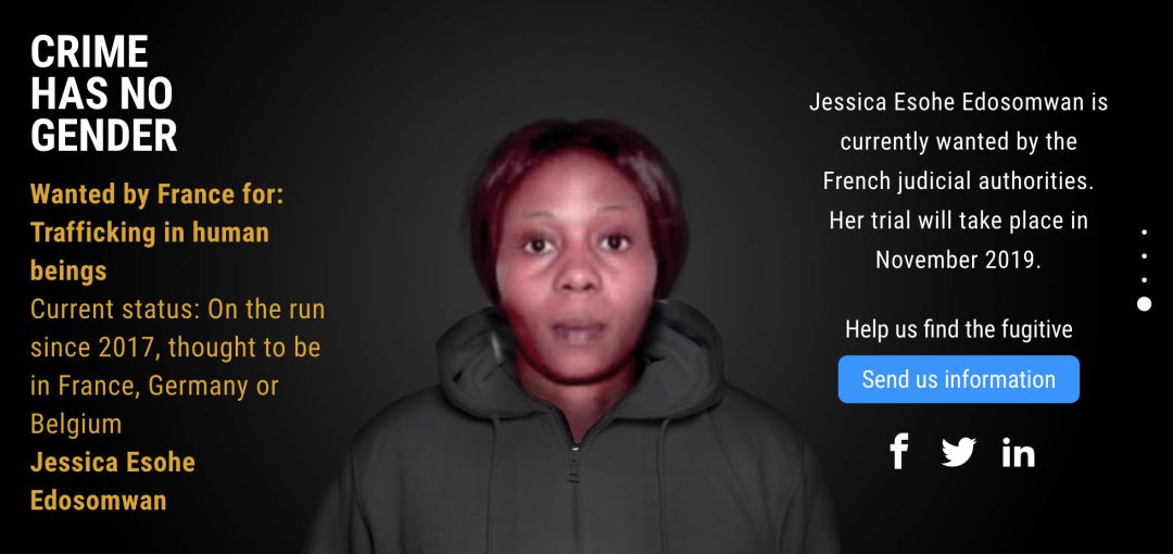 其中,法国头号通缉犯是Jessica Esohe Edosomwan,她被控贩卖人口,将于今年11月受审。Edosomwan所在的犯罪组织从尼日利亚的一些小镇中招募年轻的女孩子,承诺帮助她们前往西欧国家。等她们到达法国后,这些女孩子就被迫卖淫,陷入非常悲惨的境地。Edosomwan自2017年一直在逃,警方认为她可能藏身于法国、德国或比利时。