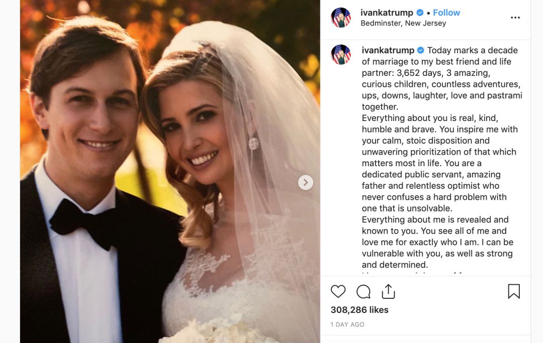 10月25日,伊万卡在社交媒体Instagram上公布了一封写给丈夫库什纳的“情书”: