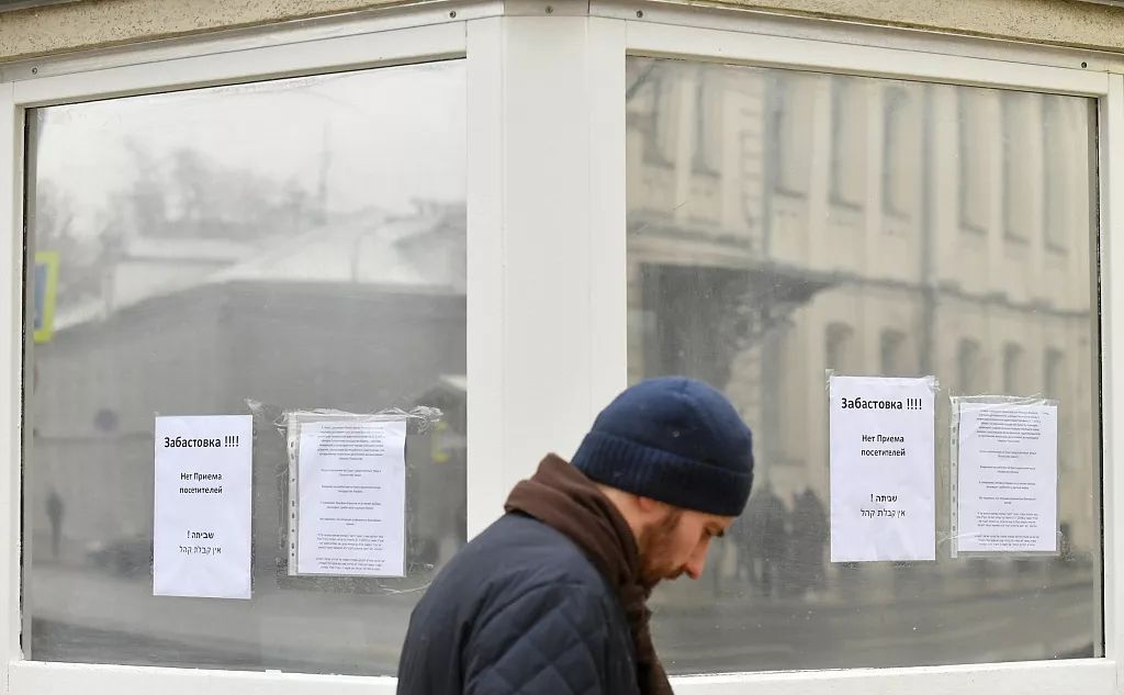 当地时间10月30日,俄罗斯莫斯科,以色列驻俄大使馆外贴着罢工声明。/视觉中国