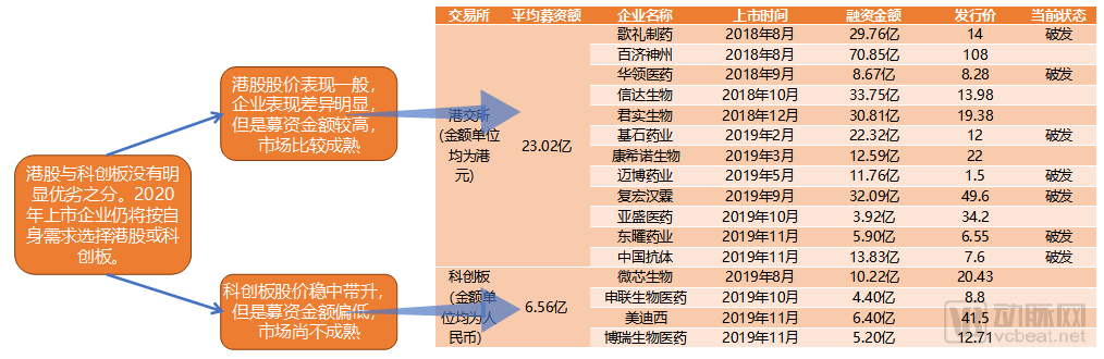另一方面,科创板上市的企业募资金额普遍偏小。募资金额最大的微芯生物也只是将将超过10亿元人民币。相比于平均募资额超过20亿港元的港股来说,上交所给企业的估值还是偏向保守,也因此我们才能看到微芯生物开盘大涨五倍的精彩瞬间。但是精彩归精彩,对于产品已经进入冲刺阶段,需要大笔资金支持的大型创新药企业,科创板的募资水平确实有点不够看。