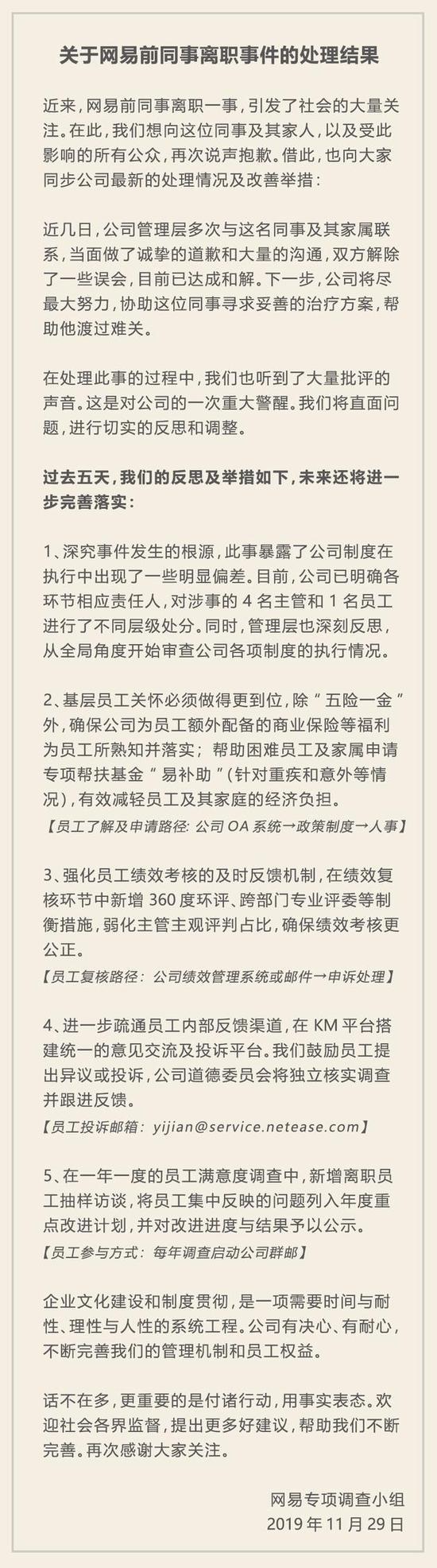 网易还在公告中公布了 5 项反思及改进措施,包括:处分 4 名涉事主管和 1 名员工、落实基层员工关怀政策、强化员工绩效考核的及时反馈机制、疏通员工内部反馈渠道、公开员工集中反映问题的处理情况等。