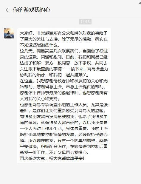 这几天,网易高层几次联系我们,当面做了很诚恳的道歉、沟通和慰问。目前,我们和网易已经达成了和解:双方一致同意,放下争议,共同去关注眼下最重要的事情 ----- 接下来,网易会全力协助我的治疗,和我们一起共渡难关。