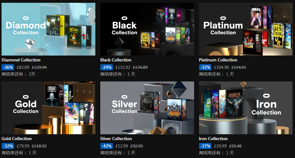 Oculus Rift铂钻捆绑包:6款游戏,原价175美元,促销价105美元(折扣力度-39%),包括《Lone Echo》,《Moss》,《SUPERHOT VR》,《Zero Caliber VR》,《Five Nights at Freddy’s VR: Help Wanted》,《Onward》。