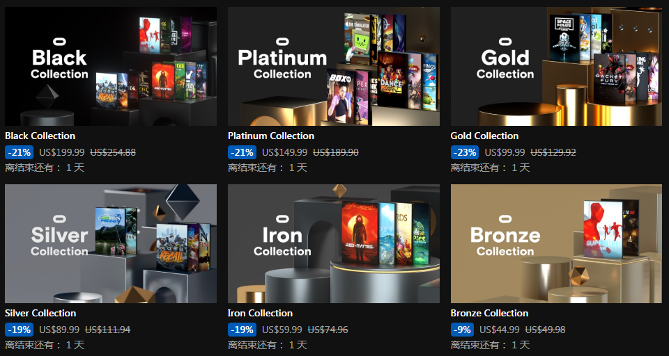 Oculus Rift铂金捆绑包:9款游戏,原价205美元,促销价115美元(折扣力度-34%),包括《Gun Club VR》,《BOXVR》,《Dance Central》,《République VR》,《Apex Construct》,《Budget Cuts》,《Richie’s Plank Experience》,《Ultrawings》,《ARKTIKA.1》。