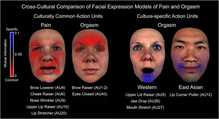 结果显示,参与者完全可以分辨“疼痛”和“性高潮”的表情,两者截然不同。他们认为,典型的疼痛表情包括把脸往内拉、降低眉毛和皱鼻子。但参与者们在性高潮时面部表情的选择和呈现上却反映出明显的东西方文化差异。西方文化背景下的参与者们倾向于选择睁大眼睛、张大嘴巴的面部表情;东方文化背景下的参与者们会选择微笑、扬起眉毛和闭上眼睛。