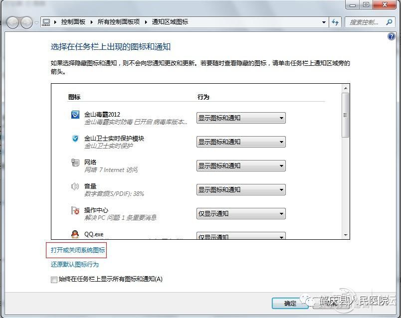 倒三角--自定义,然后点击“打开或关闭系统图标”,