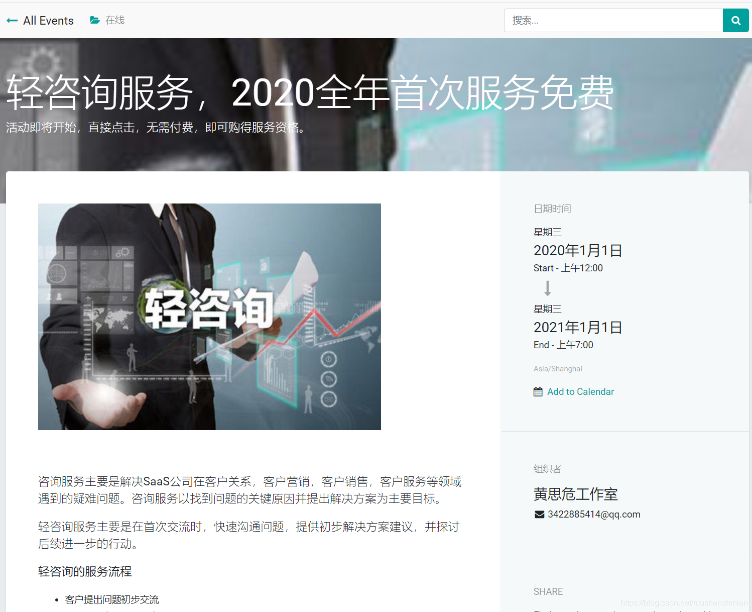 SaaS公司会经常举行各种形式的线上,线下活动,以转换客户。那么在官网上,急需一个具备全面功能的活动发布平台,包括活动议程,演讲人等信息的发布,同时,在线报名,席位预定,甚至活动门票的购买等等高级功能。以下还是通过黄思危个人网站的一个截图,分享一下活动平台的功能。