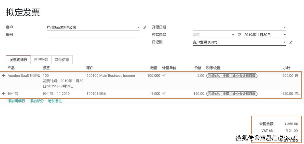 通过以上两个方面,SaaS公司在Odoo + Anodoo上可以方便地实现预付款的开票。