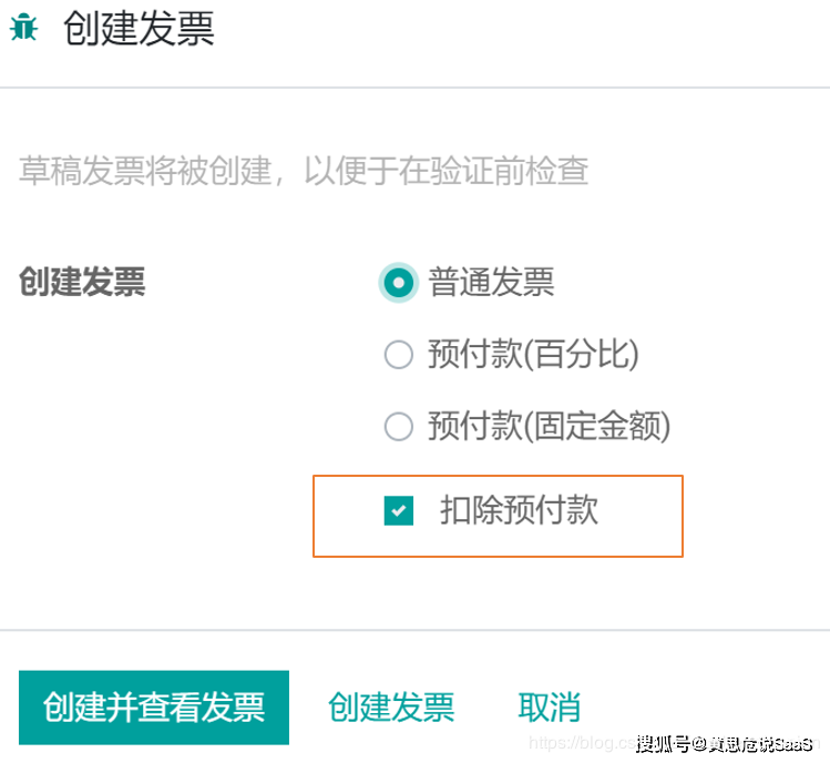 系统支持按照一定比例,或者固定金额为预付款开发票。比如预付整个合同款的30%,或者预付30万等等。如果某些项目按照合同里的某一个交付部分预付,如预付SaaS账号6个月的费用等,可参考创建交付产品的发票。