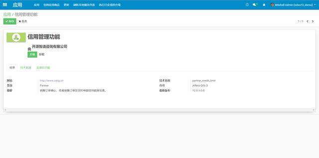 首先,我们可以通过Odoo的应用管理找到开源智造研发的信用管理功能模块,安装后在客户档案管理页面可看到下图多了一个信用管理的控制开关