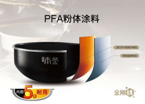苏泊尔本釜内胆涂层采用PFA粉体涂层,PFA粉体涂层是一种被广泛应用于日本高端电饭煲的食品接触用涂层,厚度在50~70 µ m,比一般不粘PTFE水性涂层更耐用,在正常煮饭条件下,可达3000周期以上的使用寿命,可正常使用5年以上,涂层也不会出现明显的脱落,而一般不粘涂层厚度仅为25~30 µ m,使用寿命仅1000周期左右。