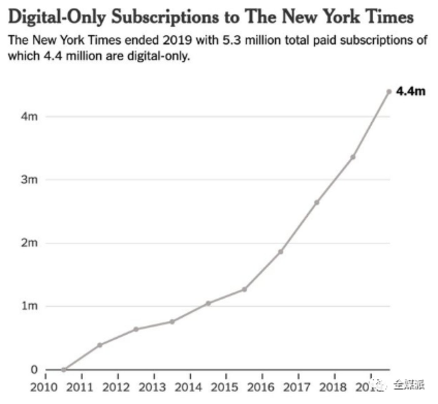 2019年末,《纽约时报》报纸和数字产品的订阅总量已经达到了525万人。其中,纯数字订阅用户总量接近440万,有将近350万是只订阅核心数字产品的读者,还有近百万用户选择订阅《纽约时报》的“烹饪”和“填字游戏”应用软件。