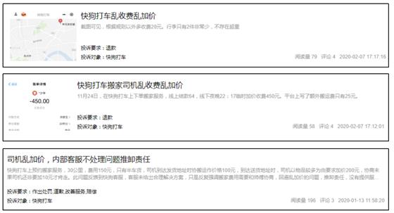 举例来说,比如在21CN聚投诉平台上,一位顾先生描述了他被快狗打车平台欺骗的经历。顾先生因为需要搬家,所以在快狗打车平台上预约了车辆进行搬家服务,总共30公里,在平台页面上显示的预估价格为150元,其中下方标注了一行小字,搬运的具体价格需要和司机商议。