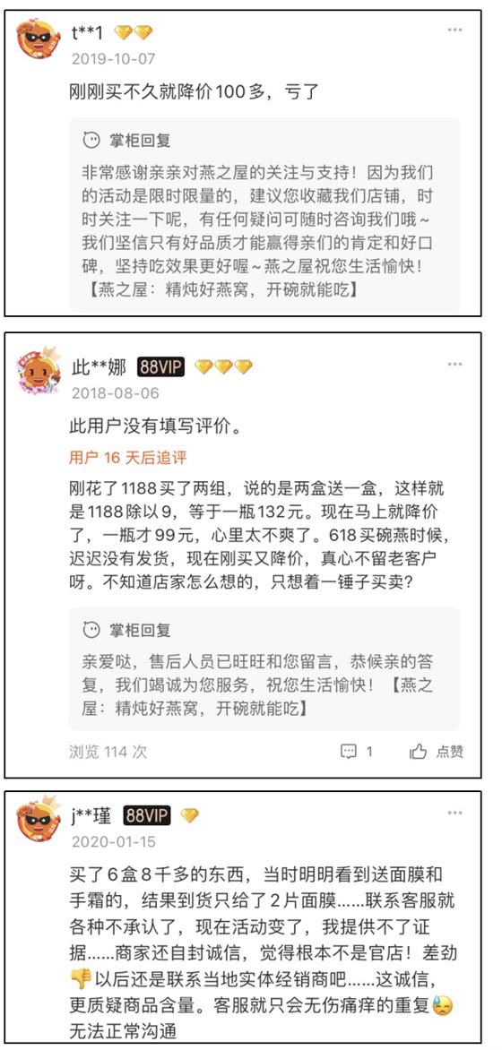 在燕之屋的天猫官方旗舰店可以看到,有多位购买了燕窝产品的消费者评价称,燕之屋的燕窝产品价位变化特别快,没几天就能降价几百块,使得消费者大有“被欺骗”的感觉。