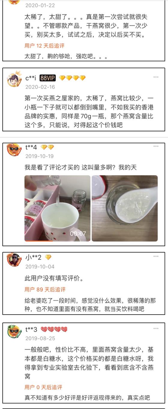 另外根据消费者评价的时间线可以看出,针对燕之屋产品质量的质疑一直都存在,但并没有得到品牌方的重视,仅仅得到官方不痛不痒的回复,完全忽略了消费者的心声。甚至从消费者的评价中可以得知,燕之屋还存在“好评返现”的违规操作,这严重影响到了消费者的购物行为,虚假的信息也使得消费者更难辨别产品真实的质量。