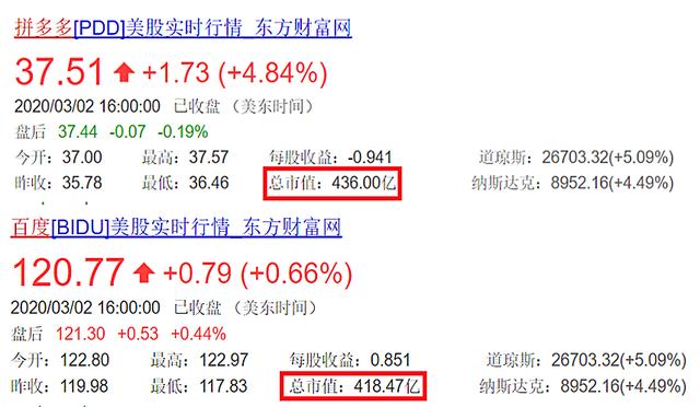 3月2日消息,昨日收盘拼多多股价上涨了4.84%,市值再创新高达到了436亿美元,而百度股价仅上涨0.66%,市值418.47亿美元。目前拼多多的市值已经超过了百度,位居中国互联网公司第五名。截止目前,中国互联网上市公司的市值排名前十位依次为阿里巴巴、腾讯、美团点评、京东、拼多多、百度、网易、小米集团、360、携程。