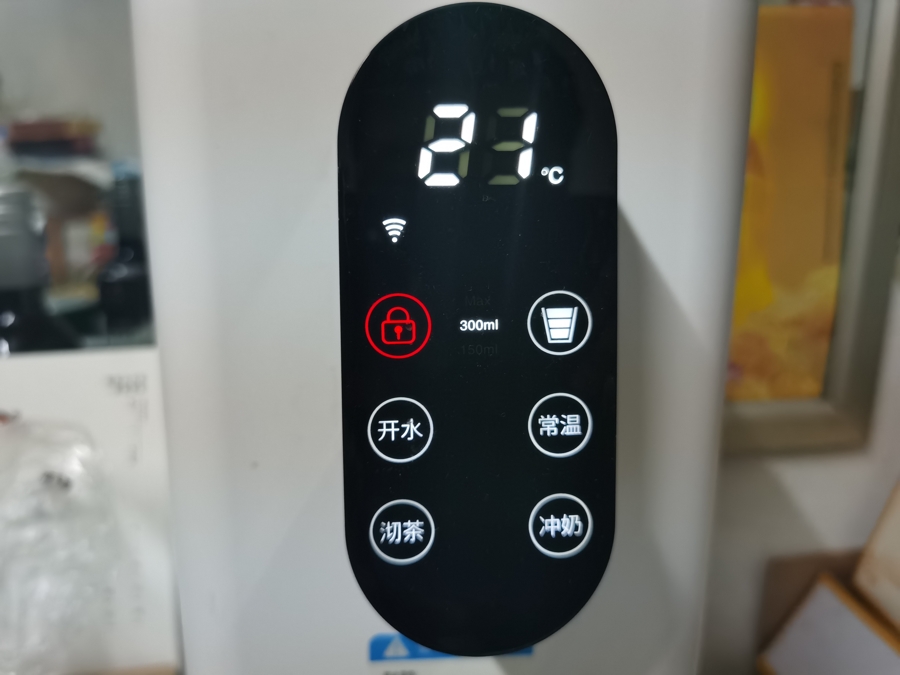 清洗完成,就可以进行正常使用了,从前部的控制面板上,可以看到左侧的锁形按键是童锁功能,防止儿童误触被烫伤,右侧是水量控制键,分别为150ml、300ml、和无限出水模式。下方是四档水温控制,分别是开水(99℃)、常温(20℃)、泡茶(85℃)、冲奶(50℃)基本上满足了一家人的不同用水需求。