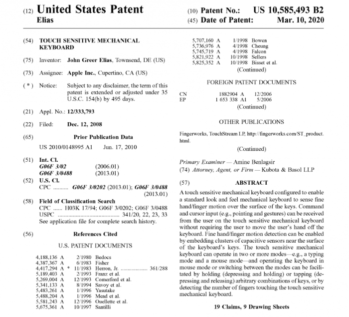 依照专利的描述,用户通过将手指在键盘表面滑动来控制光标的移动,就如同触控板一样。这些具备触控功能的按键会提供与触控板完全一致的功能,让用户实现指点操作、选择菜单项以及在屏幕上完成缩放与滚动操作,所有这一切均无需离开键盘。