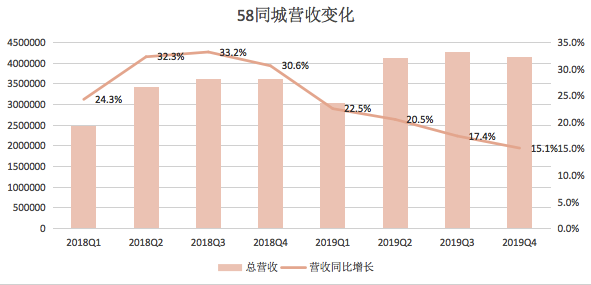 2019年第四季度,58同城实现营收41.6亿人民币,58同城董事长兼首席执行官姚劲波对此表示:“尽管宏观经济环境充满挑战,58同城四季度营收仍超过此前预期的上限。”