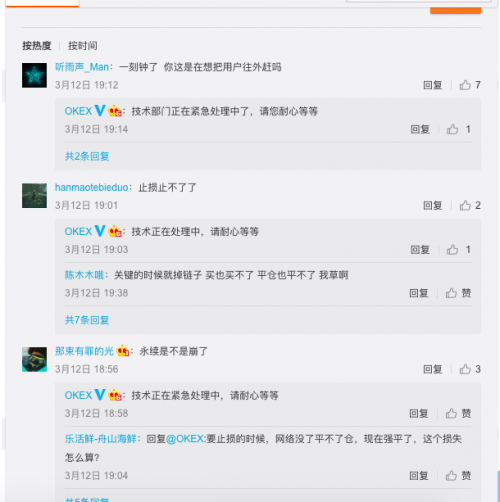 受行情影响,头部交易所出现卡顿。火币随后表示主要是因为流量过大,部分区域出现拥堵,对部分用户的访问有影响,但已扩容解决。另一个交易所OKEX更是在关键时候宕机了,很多客户在其微博下留言称“关键时刻就掉链子”。